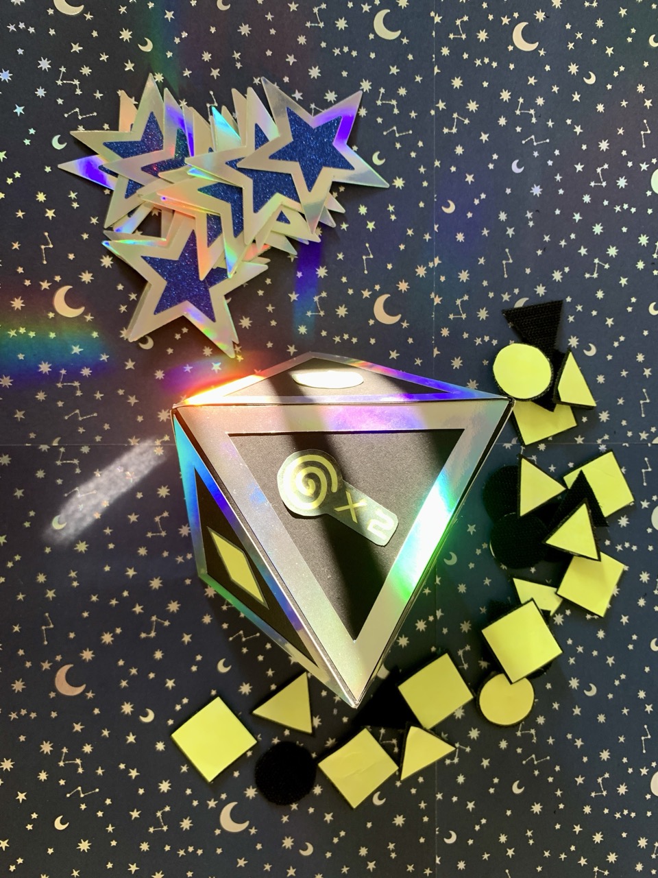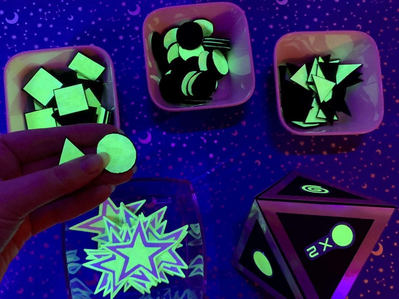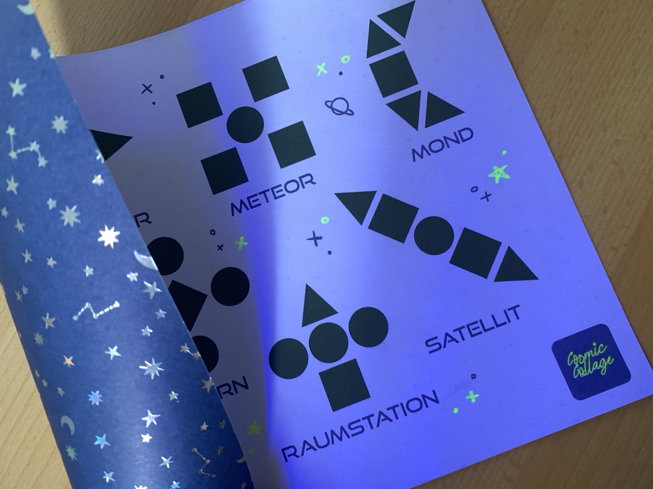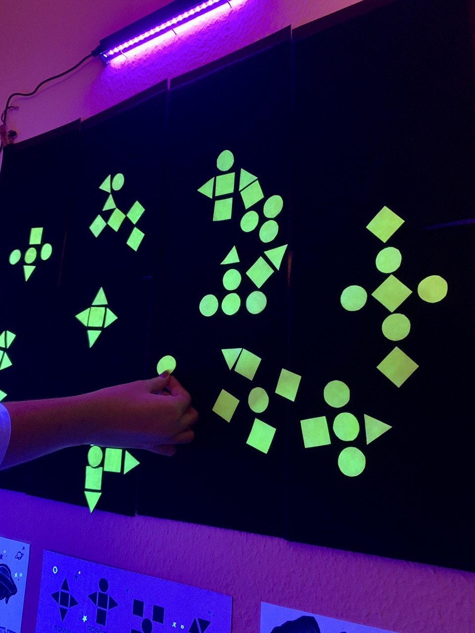 “Cosmic Collage” // Board Game // 2026 // Blacklight lamp, yellow neon paint, felt, velcro, cardboard, special effect paper